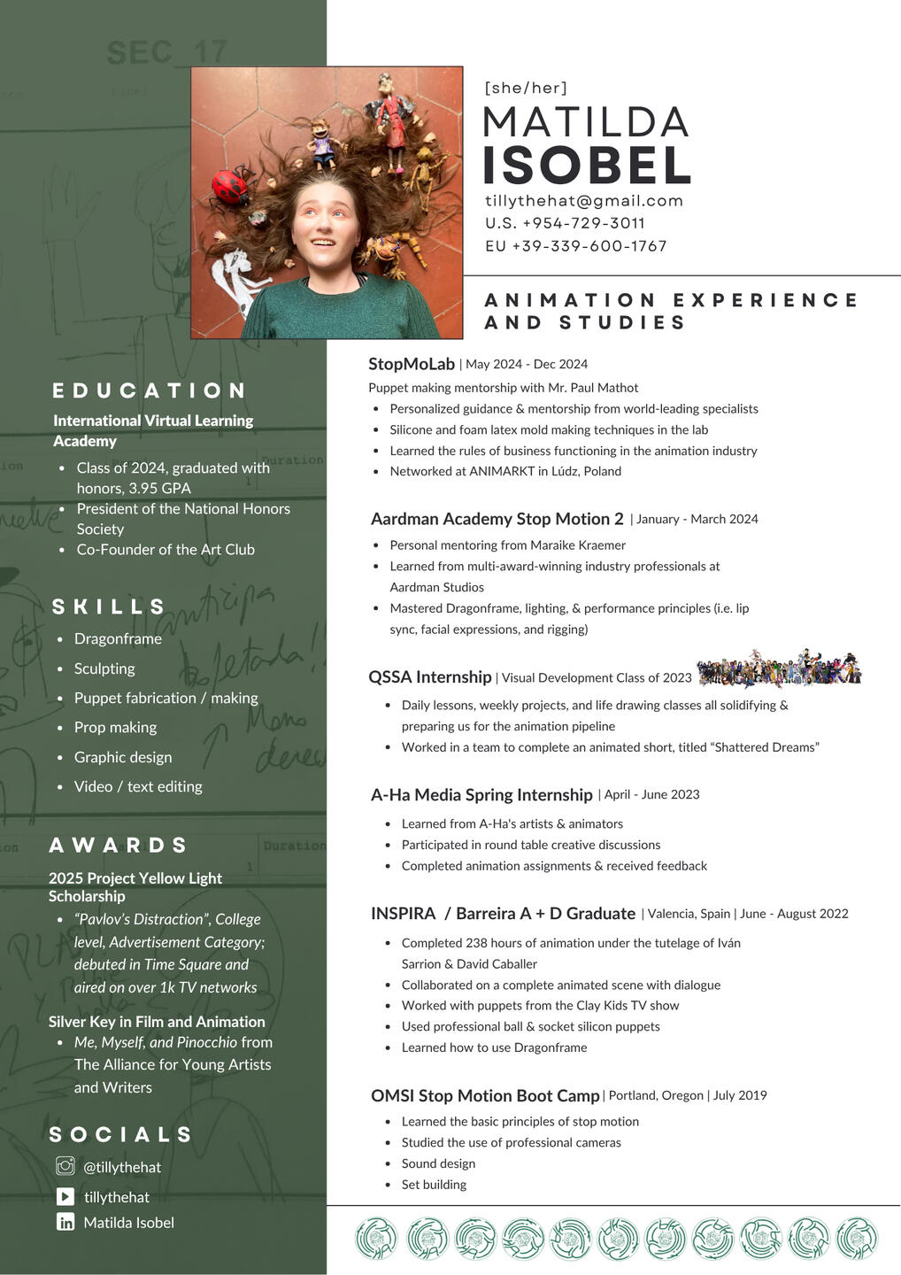 Ollo!The name’s Matilda (she/her), but my friends call me Tilly. Currently based in Italy and on the cusp of college, though I tend to go wherever the work takes me.I have been fortunate enough to have traveled and absorbed every continent except Antarctica over the course of my upbringing and it has shown me the good, bad, and the very ugly we are capable of, which in turn bleeds into my work. I am not afraid to put in the hours, get my hands grimy, and work as a team to make something beautiful, impactful, to scare the comfortable.I am “simply” a walking, talking museum of everyone and everything I have ever loved, a product of one badass single mom and too many DVD movies, and stop-motion just so happens to be one of the many ways I display it all.Sometimes I think the only way at the end of the day.